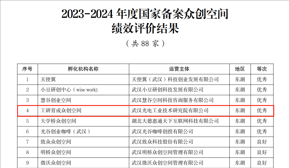 在國家級科技企業孵化器(含7家國家專業化眾創空間)績效評價中,武漢光谷生物醫藥孵化器、武漢光電工研科技企業孵化器、武漢新能源科技企業孵化器、光電顯示國家專業化眾創空間、智能制造裝備國家專業化眾創空間、新能源國家專業化眾創空間均獲評“良好”。